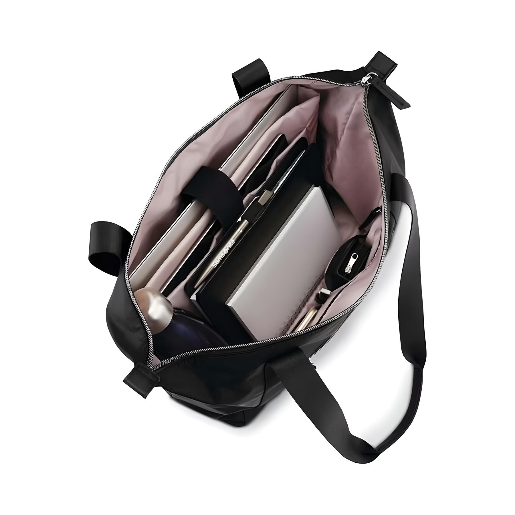 Redefine spaciousness with our generously-sized tote. It effortlessly fits your laptop, change of clothes, gym gear, and more, all while maintaining a sleek profile. The wide-mouthed, zippered closure ensures easy packing and quick access. From dawn to dusk, workday to weekend, this versatile bag adapts to your changing needs with effortless grace.